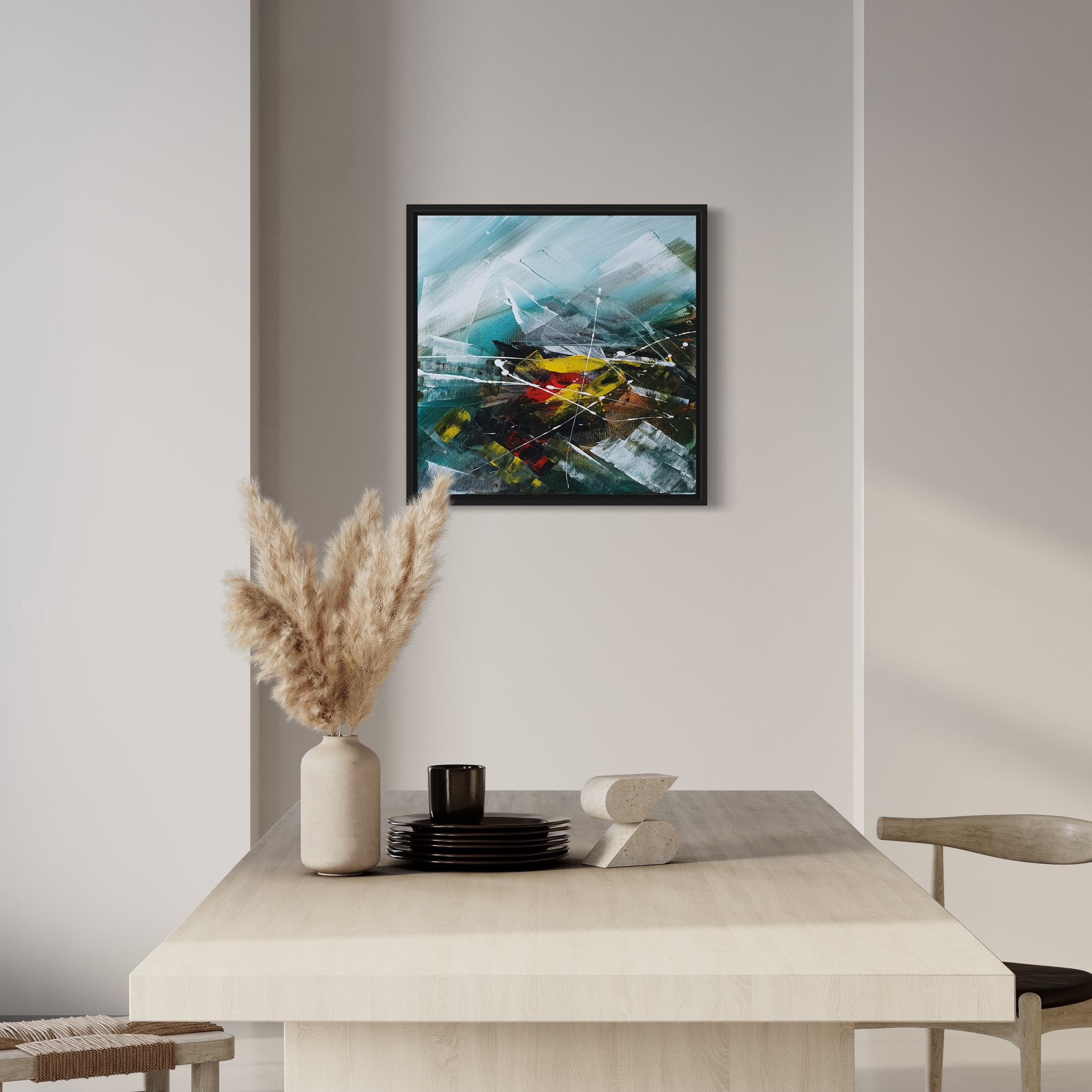 "The Samaritan" evokes a sense of compassion and empathy through abstract forms and colors, inviting viewers to explore the depths of human connection and kindness without relying on literal representation.