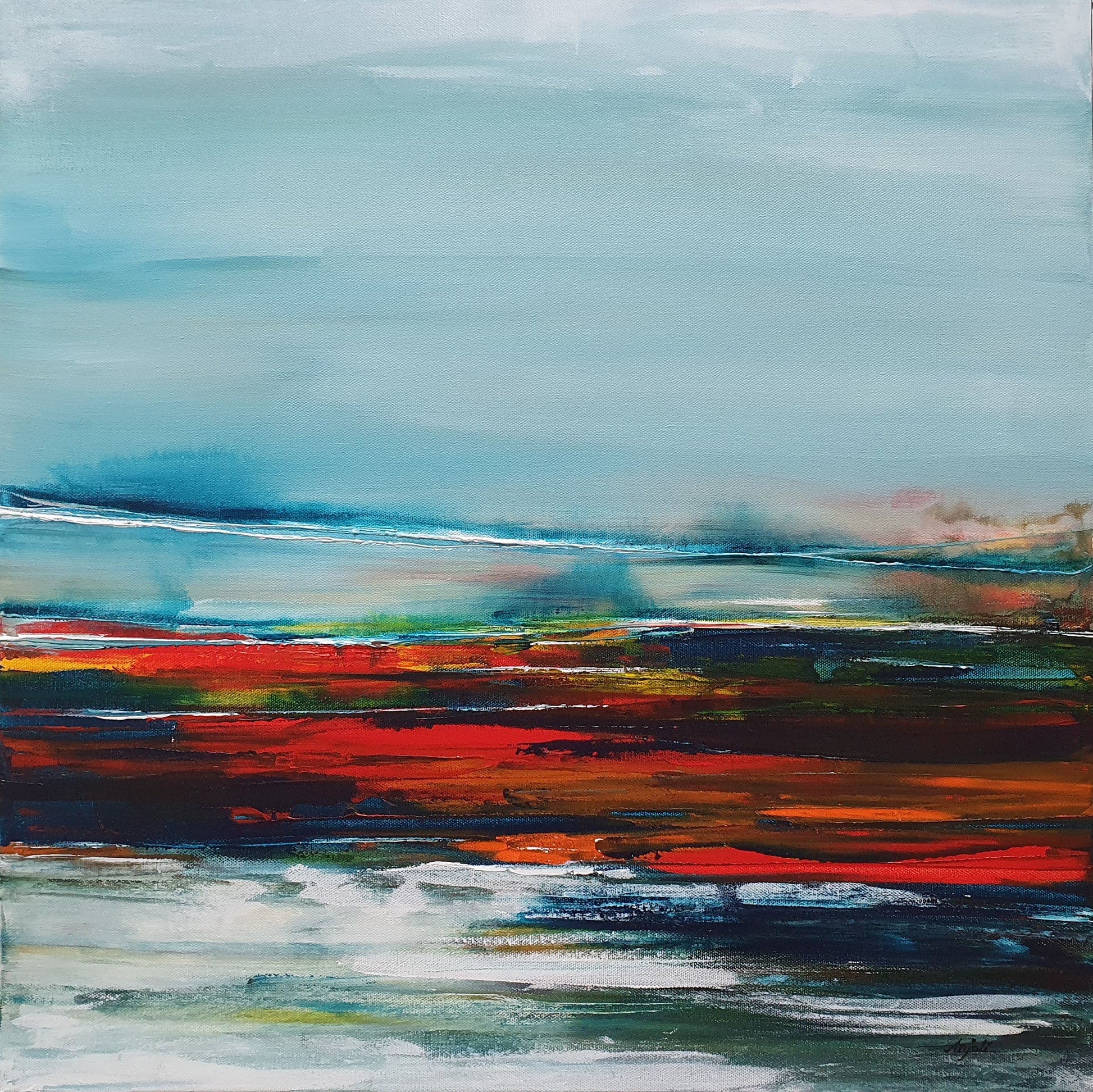"Dive into a world of vivid hues with 'Turquoise Horizon,' where the fusion of blue, white, red, and yellow paints a mesmerizing abstract landscape. Using a palette knife and a delicate touch, I've crafted a scene where the sky blends seamlessly into the land, capturing the essence of nature's beauty in every stroke."