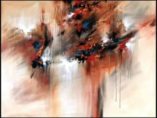 “Universe’s Sign” is an abstract painting featuring a dynamic interplay of warm and cool colors. A deep brown and black background anchors the composition, while a central flow of black blended colors creates movement. Surrounding this central flow, bursts of red, orange, blue, and white pop against the dark backdrop, evoking cosmic phenomena. This vibrant contrast suggests the powerful and mysterious nature of the universe.