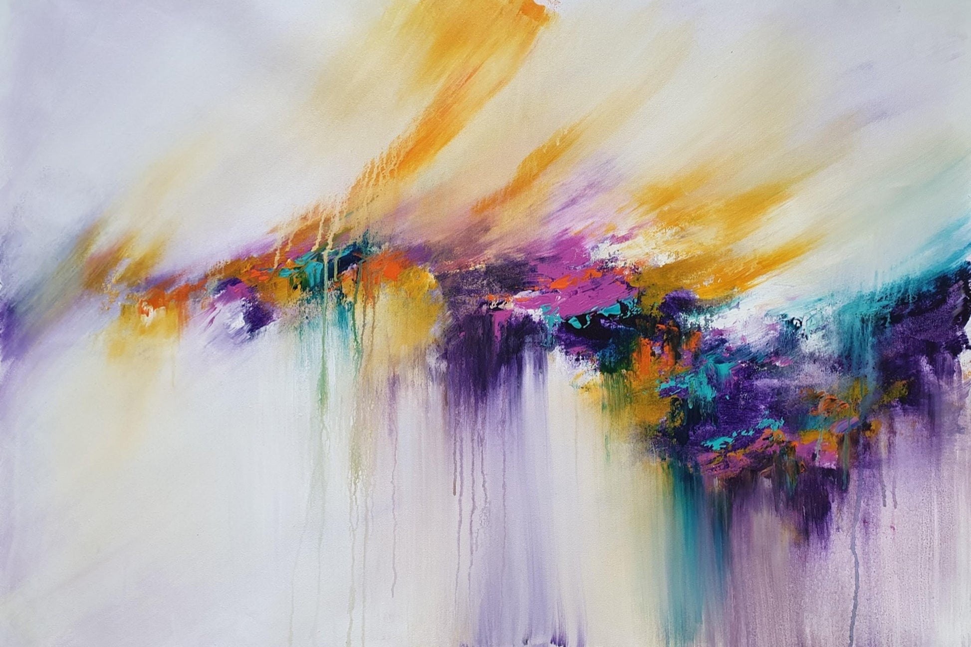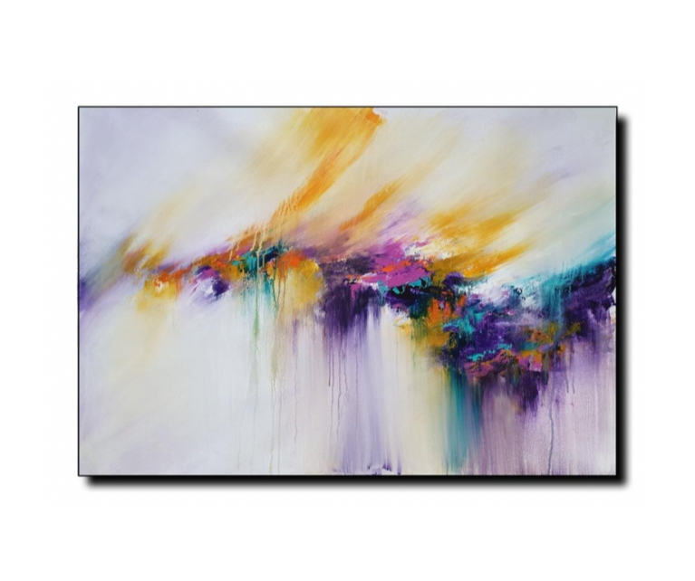 A delicate fusion of golden hues, violet tones, and vibrant turquoise that cascades across the canvas like a serene dream. This abstract piece evokes a sense of tranquility and movement, offering an interplay of light and shadow that stirs the imagination.